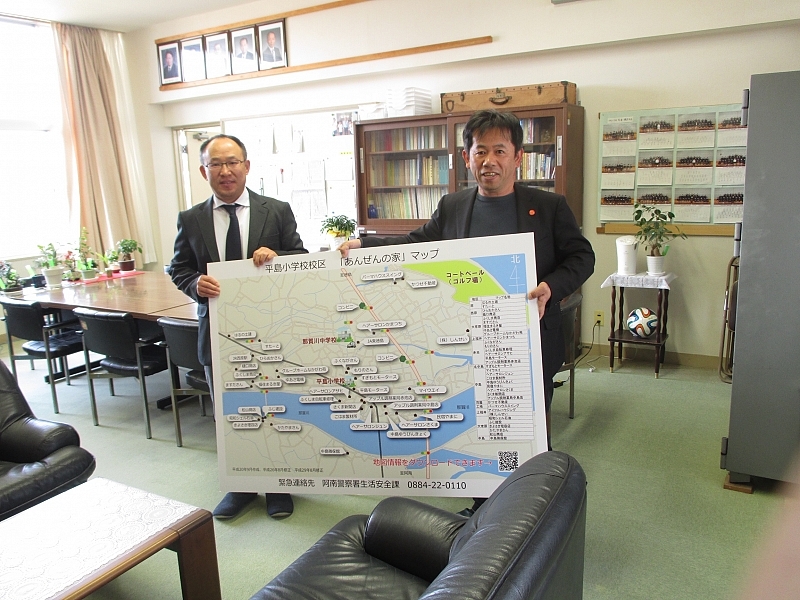 今日は、青少年育成協議会会長として、今津小学校、平島小学校に、子供が不審者から逃げ込める安心マップを寄付してきました。