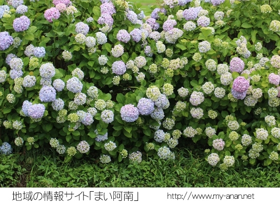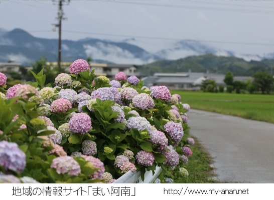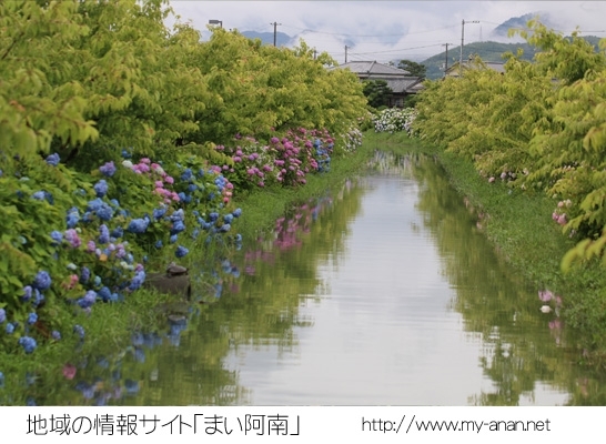 場所は徳島県阿南市那賀川町にある自衛隊、那賀川駐屯地西側の川沿いに紫陽花がきれいに咲いています。