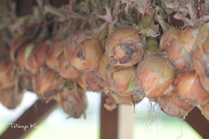 玉ねぎの収穫が終わり、農家の軒先には玉ねぎをつるしてある光景が。
