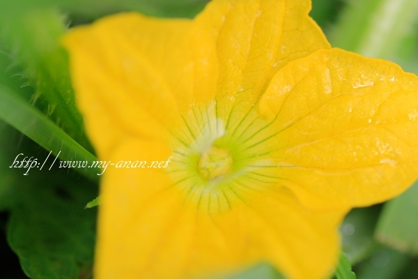 雨上がり、かぼちゃの花に雨水が溜まっていました。トンボや蝶が水を飲みに来るかなった、ほんわかした風景でした。