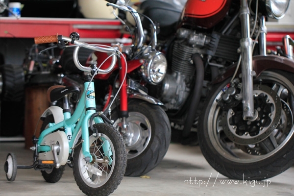 バイクの部屋に末っ子がが自分の自転車を並べていました。