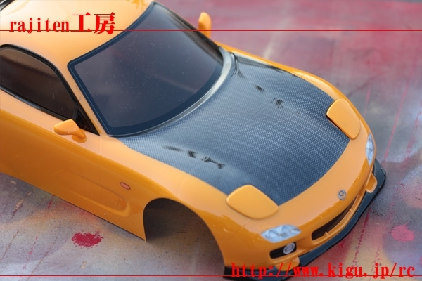 タミヤRX7のボディーを黄色でボンネットをカーボン調に塗装しました。