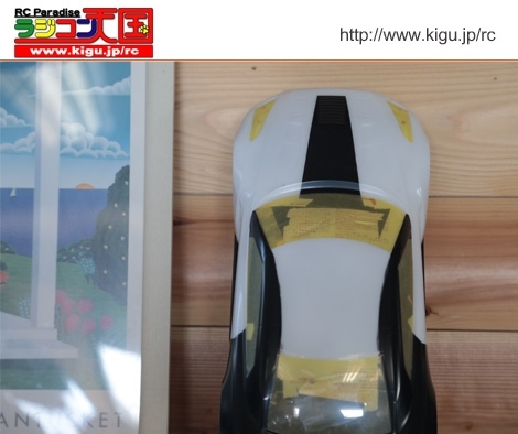 全面マスキングで、フロントとリア、またバックスクリーン枠はカーボン調塗装で仕上げます。