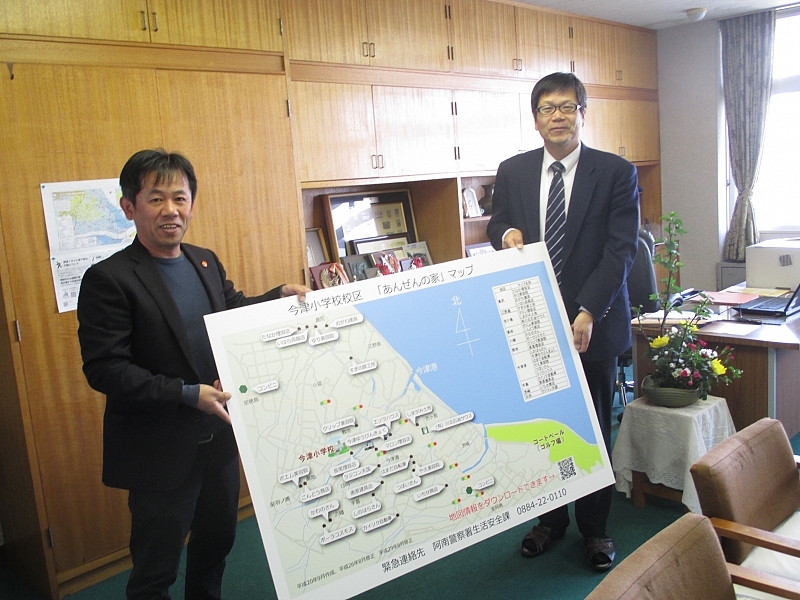 今日は、青少年育成協議会会長として、今津小学校、平島小学校に、子供が不審者から逃げ込める安心マップを寄付してきました。